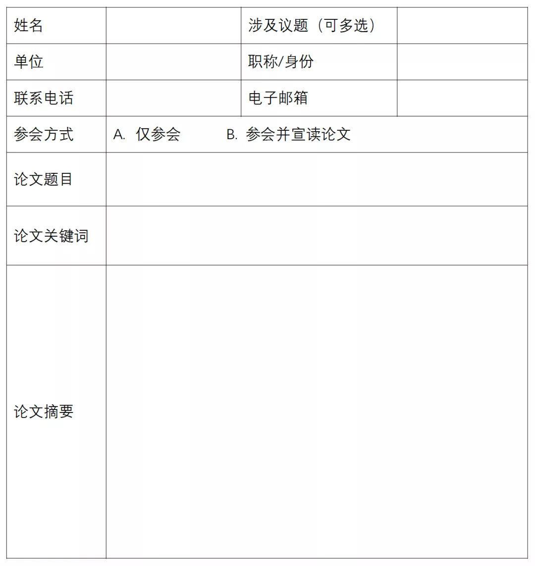 4. 摘要要求:聚焦会议议题,中文摘要500字左右,英文摘要300词左右。请报名者按回执表(见文末下载)进行填写。
