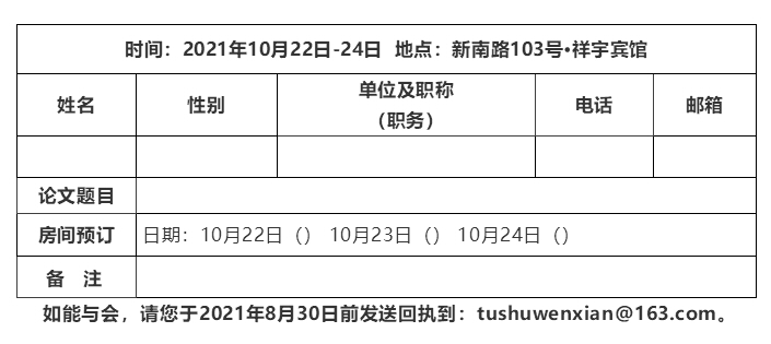 如能与会,请您于9月30日前提交word版参会论文至tushuwenxian@163.com,以便会务组提前印制会议论文集,供与会者交流。
