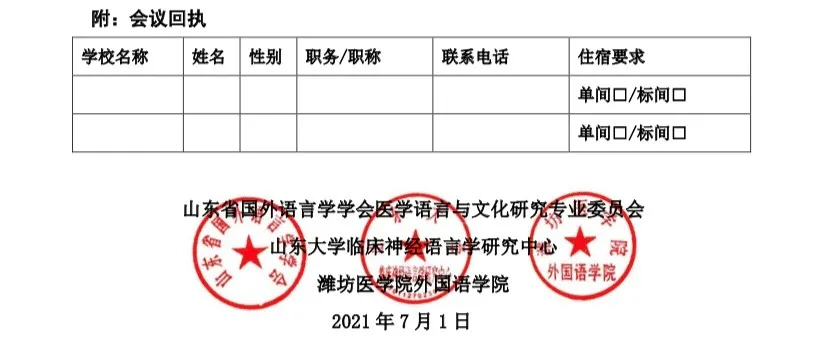 会议由山东省国外语言学学会医学语言与文化专业委员会、山东大学临床神经语言学研究中心主办,潍坊医学院外国语学院承办,将邀请国内外相关领域专家做主旨发言、围绕相关议题开展学术交流与研讨。同时,会议期间还将举办山东省国外语言学学会医学语言与文化研究专委会 2021 年常务理事会和年会等相关活动。现诚挚邀请您参加本次会议。